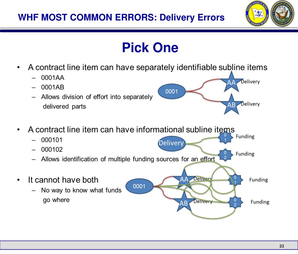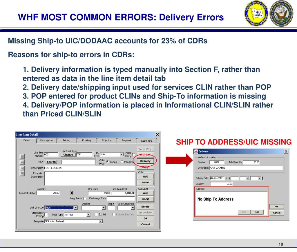WHF MOST COMMON ERRORS: Delivery Errors • Missing Ship-to UIC/DODAAC accounts for 23% of CDRs • Reasons for ship-to errors in CDRs: • 1. Delivery information is typed manually into Section F, rather than entered as data in the line item detail tab • 2. Delivery date/shipping input used for services CLIN rather than POP • 3. POP entered for product CLINs and Ship-To information is missing • 4. Delivery/POP information is placed in Informational CLIN/SLIN rather than Priced CLIN/SLIN SHIP TO ADDRESS/UIC MISSING