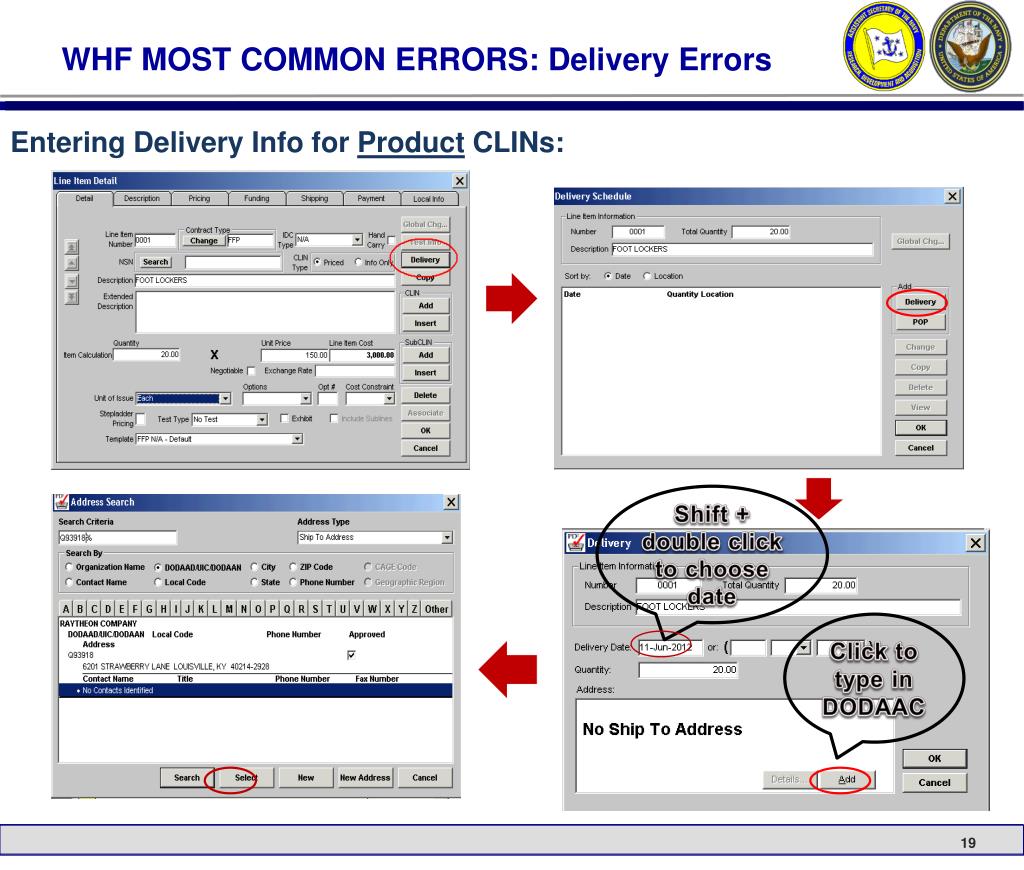 WHF MOST COMMON ERRORS: Delivery Errors Entering Delivery Info for Product CLINs: Shift + double click to choose date Click to type in DODAAC