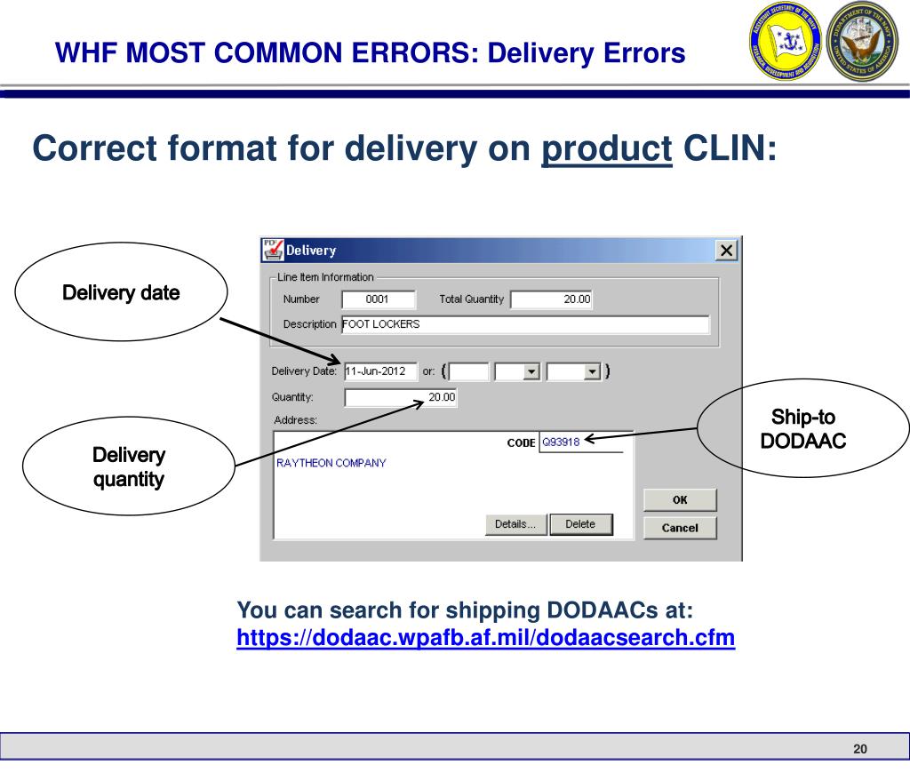WHF MOST COMMON ERRORS: Delivery Errors Correct format for delivery on product CLIN: Delivery date Ship-to DODAAC Delivery quantity You can search for shipping DODAACs at: https://dodaac.wpafb.af.mil/dodaacsearch.cfm