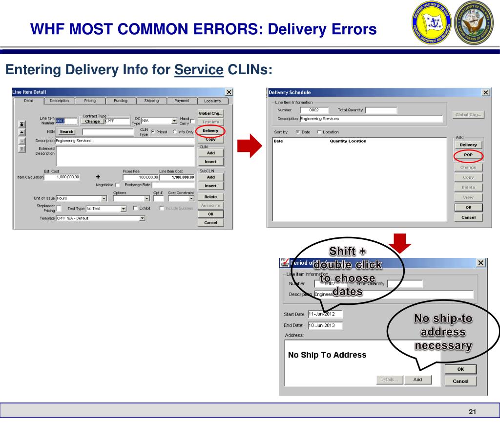 WHF MOST COMMON ERRORS: Delivery Errors Entering Delivery Info for Service CLINs: Shift + double click to choose dates No ship-to address necessary