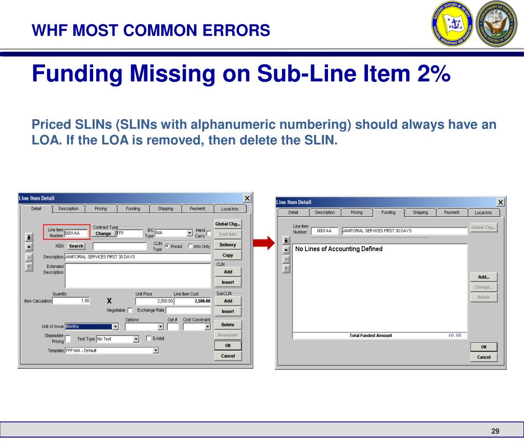 WHF MOST COMMON ERRORSFunding Missing on Sub-Line Item 2% Priced SLINs (SLINs with alphanumeric numbering) should always have an LOA. If the LOA is removed, then delete the SLIN.