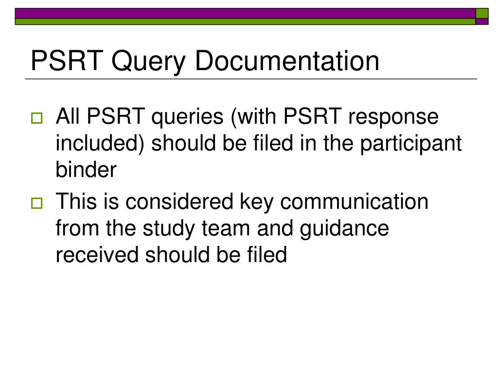 PSRT Query Documentation • All PSRT queries (with PSRT response included) should be filed in the participant binder • This is considered key communication from the study team and guidance received should be filed