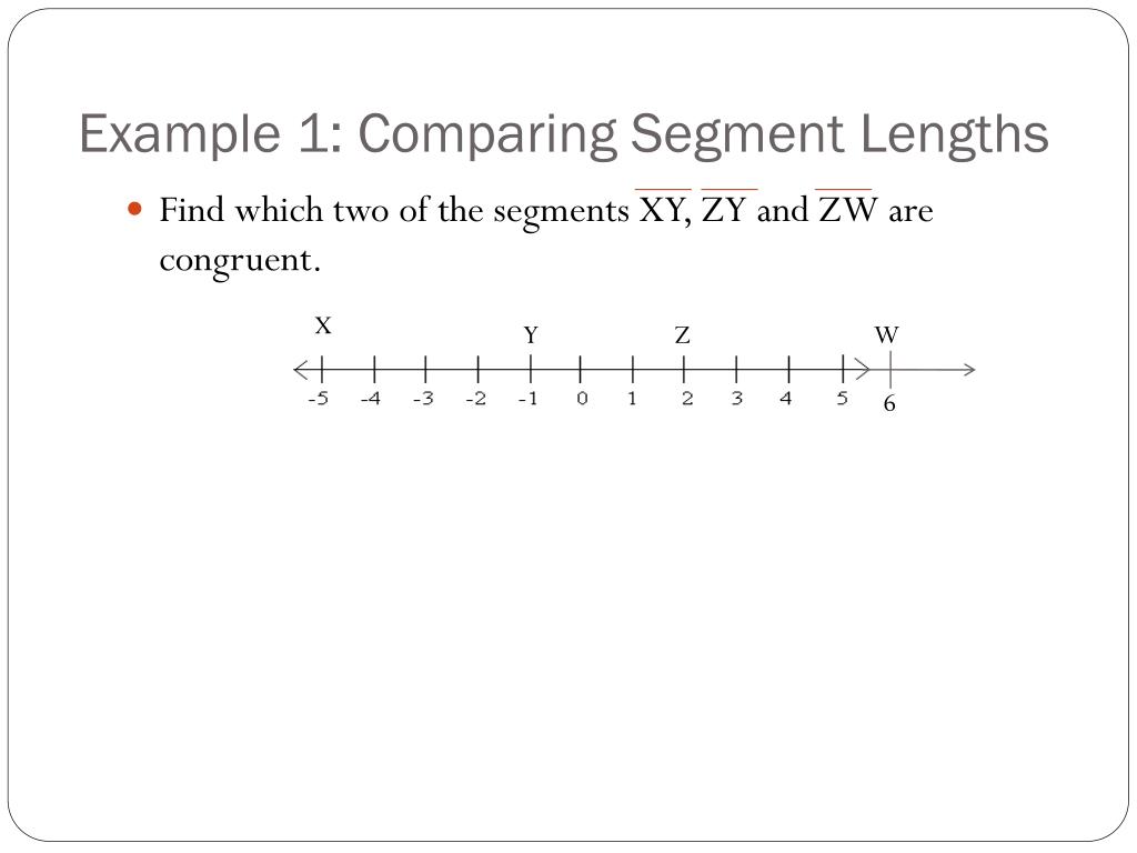 Example 1: Comparing Segment Lengths • Find which two of the segments XY, ZY and ZW are congruent. X Y Z W 6
