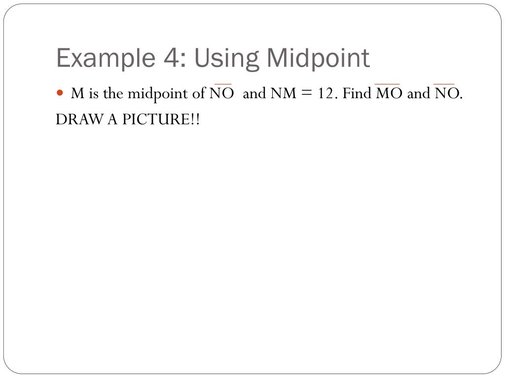 Example 4: Using Midpoint • M is the midpoint of NO and NM = 12. Find MO and NO. DRAW A PICTURE!!