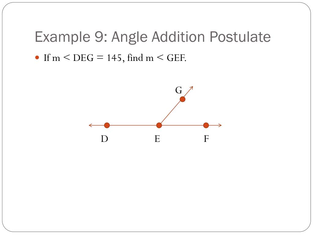 Example 9: Angle Addition Postulate • If m < DEG = 145, find m < GEF. G D E F