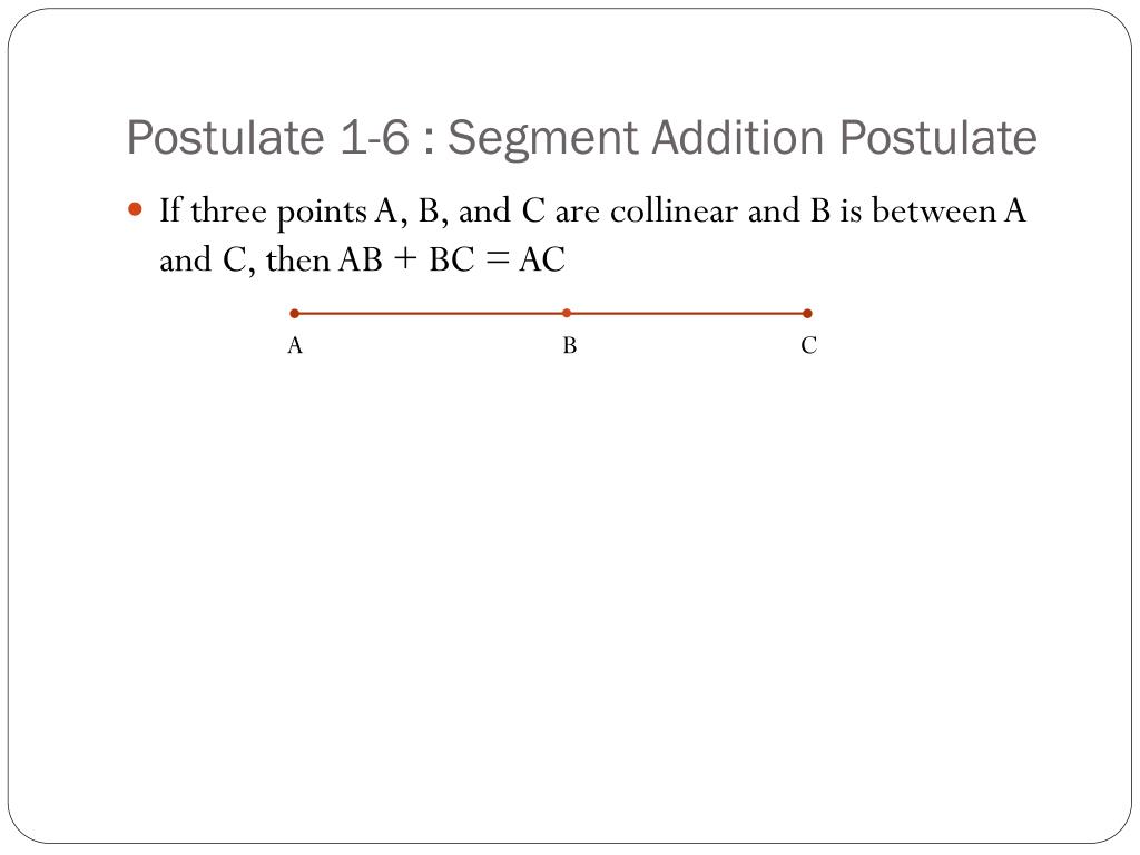Postulate 1-6 : Segment Addition Postulate • If three points A, B, and C are collinear and B is between A and C, then AB + BC = AC . A B C