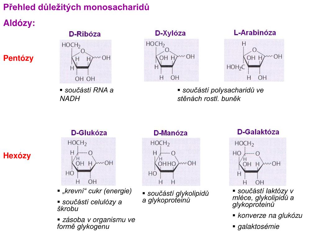 Přehled důležitých monosacharidů Aldózy: Pentózy • součástí RNA a NADH • součástí polysacharidů ve stěnách rostl. buněk Hexózy • „krevní“ cukr (energie) • součástí celulózy a škrobu • zásoba v organismu ve formě glykogenu • součástí laktózy v mléce, glykolipidů a glykoproteinů • konverze na glukózu • galaktosémie • součástí glykolipidů a glykoproteinů