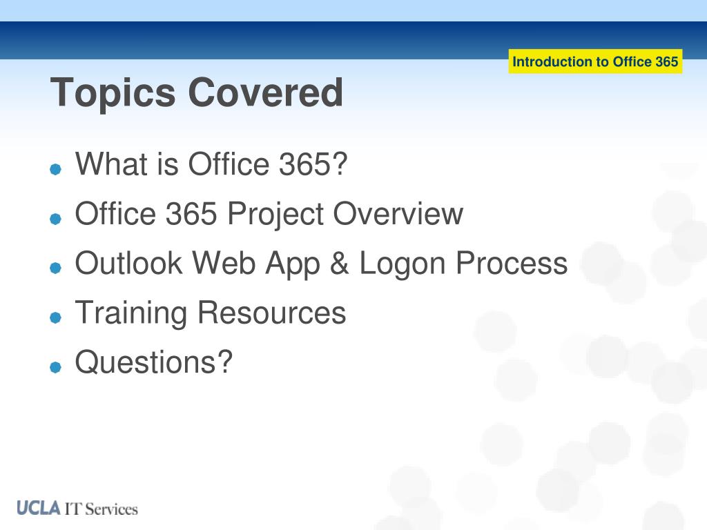 Introduction to Office 365. January 2014 Presenter: Michael Miller. Topics Covered. What is Office 365? Office 365 Project Overview Outlook Web App & Logon Process Training Resources Questions?. What is Office 365?.