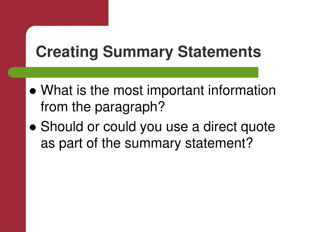 Creating Summary Statements • What is the most important information from the paragraph? • Should or could you use a direct quote as part of the summary statement?