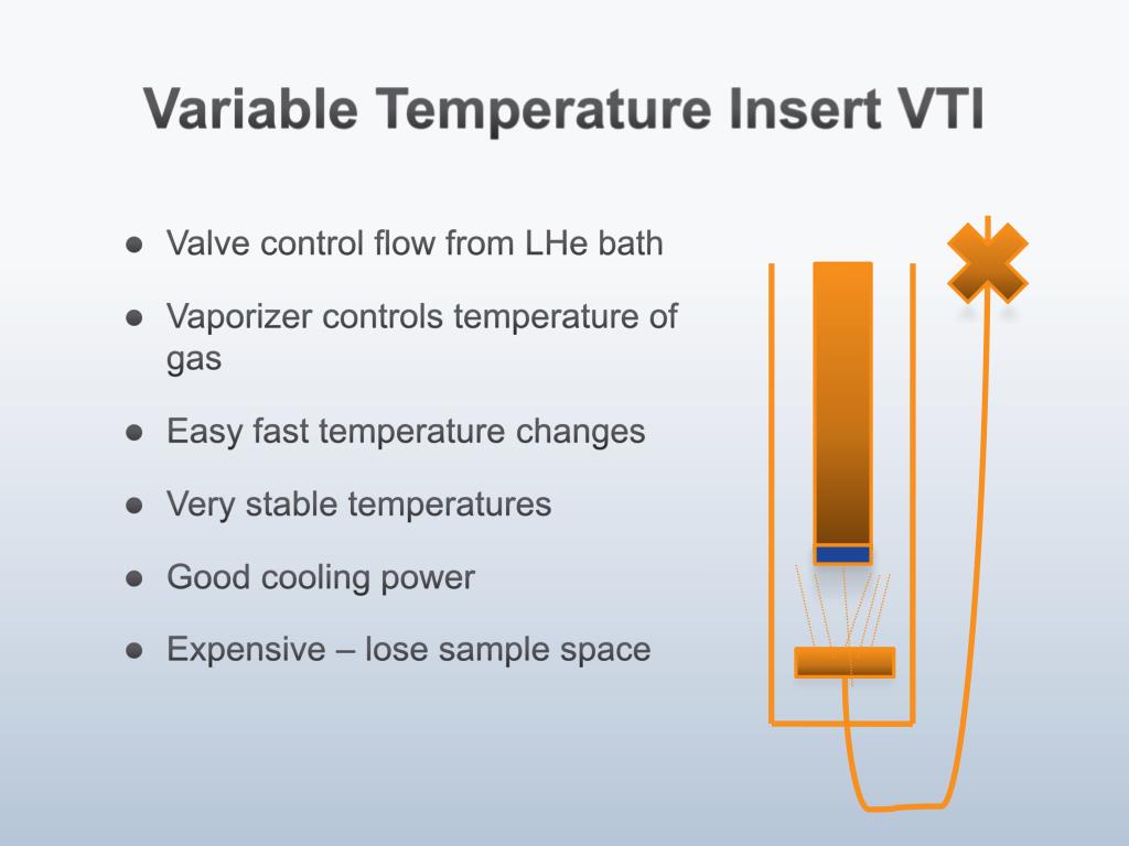 Variable Temperature Insert VTI • Valve control flow from LHe bath • Vaporizer controls temperature of gas • Easy fast temperature changes • Very stable temperatures • Good cooling power • Expensive – lose sample space