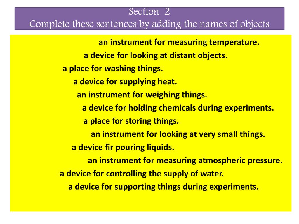 Section 2Complete these sentences by adding the names of objects • A thermometer is an instrument for measuring temperature. • A telescope is a device for looking at distant objects. • A sink is a place for washing things. • A burner is a device for supplying heat. • A balance is an instrument for weighing things. • A test-tube is a device for holding chemicals during experiments. • A cupboard is a place for storing things. • A microscope is an instrument for looking at very small things. • A funnel is a device fir pouring liquids. • A barometer is an instrument for measuring atmospheric pressure. • A tap is a device for controlling the supply of water. • A stand is a device for supporting things during experiments.