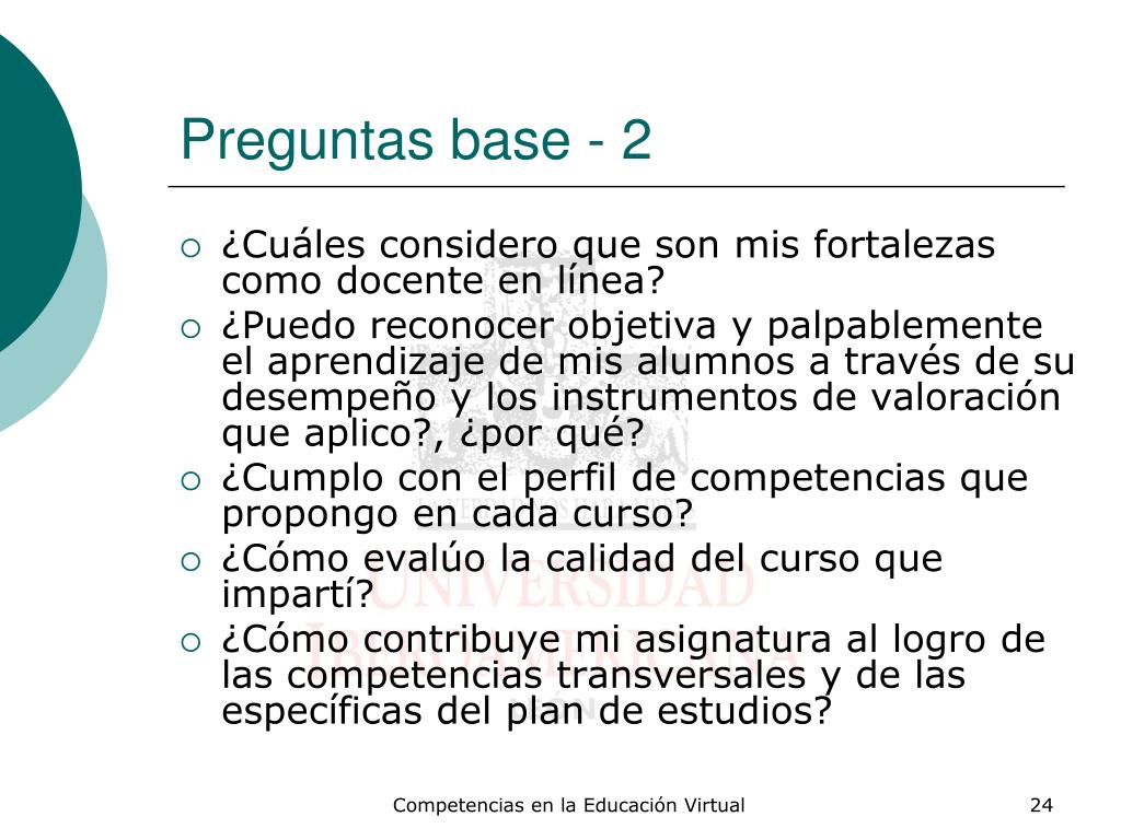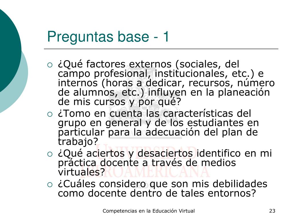 Preguntas base - 1 • ¿Qué factores externos (sociales, del campo profesional, institucionales, etc.) e internos (horas a dedicar, recursos, número de alumnos, etc.) influyen en la planeación de mis cursos y por qué? • ¿Tomo en cuenta las características del grupo en general y de los estudiantes en particular para la adecuación del plan de trabajo? • ¿Qué aciertos y desaciertos identifico en mi práctica docente a través de medios virtuales? • ¿Cuáles considero que son mis debilidades como docente dentro de tales entornos? Competencias en la Educación Virtual