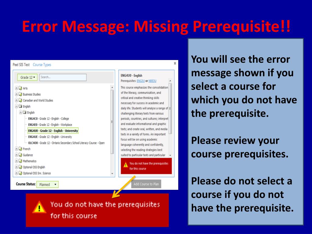 Error Message: Missing Prerequisite!! You will see the error message shown if you select a course for which you do not have the prerequisite. Please review your course prerequisites. Please do not select a course if you do not have the prerequisite.