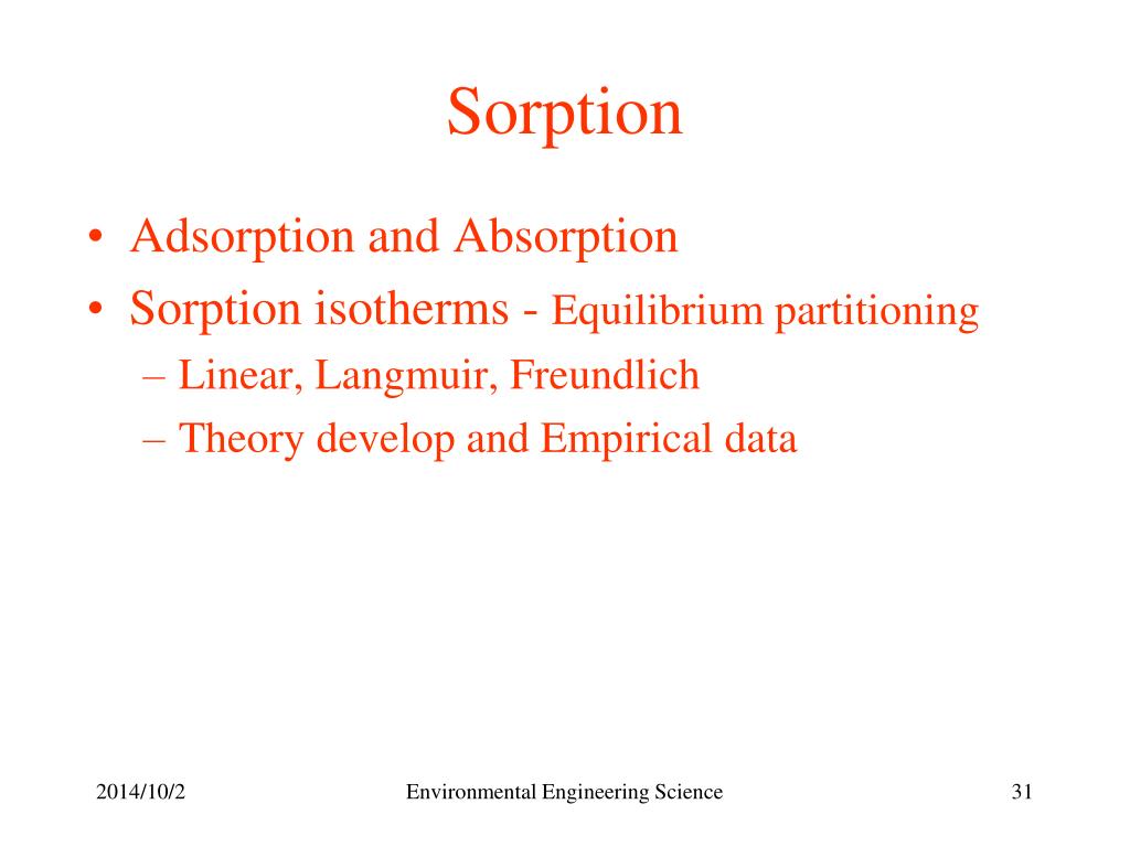 Sorption • Adsorption and Absorption • Sorption isotherms - Equilibrium partitioning • Linear, Langmuir, Freundlich • Theory develop and Empirical data Environmental Engineering Science