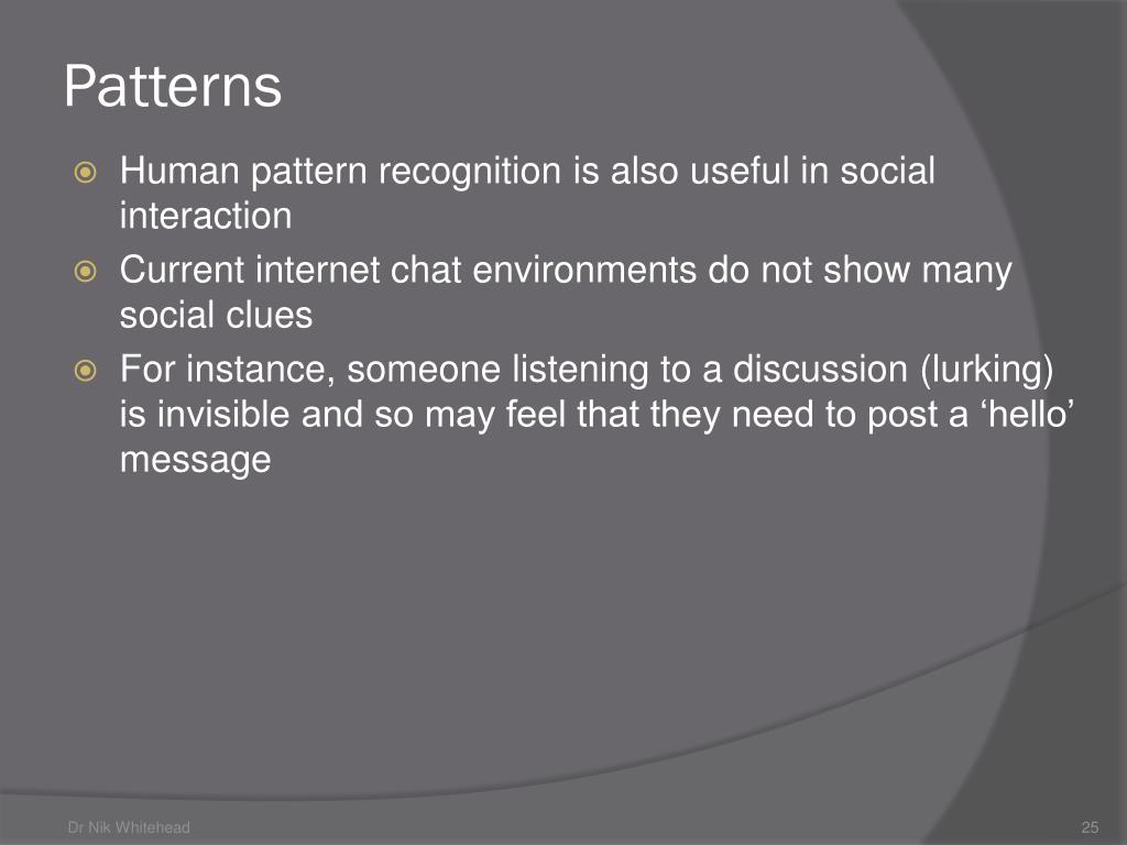 Patterns • Human pattern recognition is also useful in social interaction • Current internet chat environments do not show many social clues • For instance, someone listening to a discussion (lurking) is invisible and so may feel that they need to post a ‘hello’ message