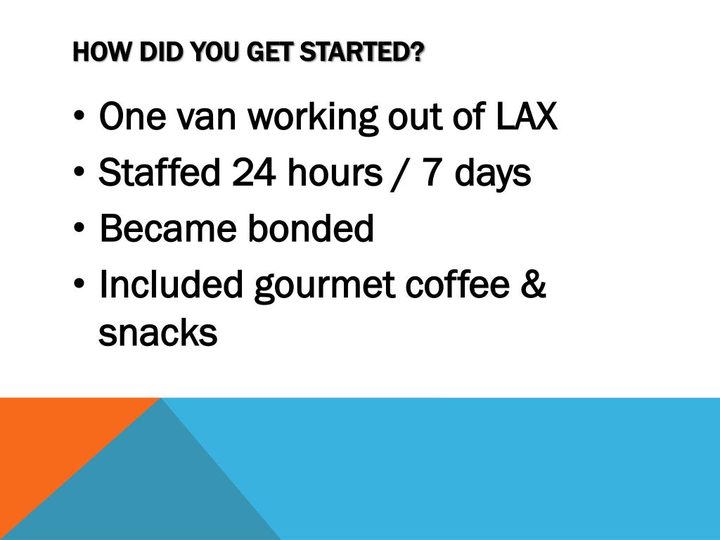 How did you get started? • One van working out of LAX • Staffed 24 hours / 7 days • Became bonded • Included gourmet coffee & snacks