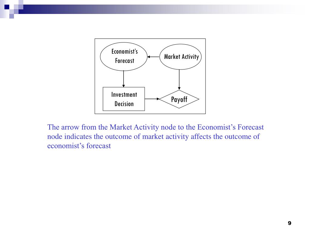 Economist’s Forecast Market Activity Investment Decision Payoff The arrow from the Market Activity node to the Economist’s Forecast node indicates the outcome of market activity affects the outcome of economist’s forecast