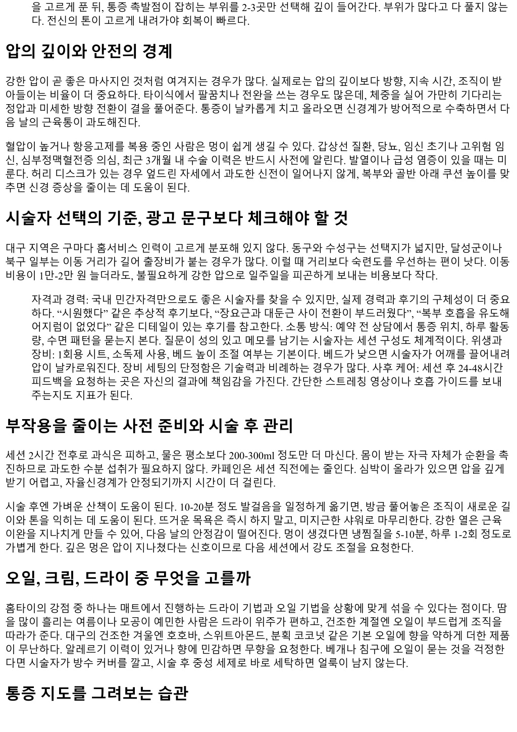 을고르게푼뒤, 통증촉발점이잡히는부위를 2-3곳만선택해깊이들어간다. 부위가많다고다풀지않는 다. 전신의톤이고르게내려가야회복이빠르다. 압의깊이와안전의경계 강한압이곧좋은마사지인것처럼여겨지는경우가많다. 실제로는압의깊이보다방향, 지속시간, 조직이받 아들이는비율이더중요하다. 타이식에서팔꿈치나전완을쓰는경우도많은데, 체중을실어가만히기다리는 정압과미세한방향전환이결을풀어준다. 통증이날카롭게치고올라오면신경계가방어적으로수축하면서다 음날의근육통이과도해진다. 혈압이높거나항응고제를복용중인사람은멍이쉽게생길수있다. 갑상선질환, 당뇨, 임신초기나고위험임 신, 심부정맥혈전증의심, 최근 3개월내수술이력은반드시사전에알린다. 발열이나급성염증이있을때는미 룬다. 허리디스크가있는경우엎드린자세에서과도한신전이일어나지않게, 복부와골반아래쿠션높이를맞 추면신경증상을줄이는데도움이된다. 시술자선택의기준, 광고문구보다체크해야할것 대구지역은구마다홈서비스인력이고르게분포해있지않다. 동구와수성구는선택지가넓지만, 달성군이나 북구일부는이동거리가길어출장비가붙는경우가많다. 이럴때거리보다숙련도를우선하는편이낫다. 이동 비용이 1만-2만원늘더라도, 불필요하게강한압으로일주일을피곤하게보내는비용보다작다. 자격과경력: 국내민간자격만으로도좋은시술자를찾을수있지만, 실제경력과후기의구체성이더중요 하다. “시원했다” 같은추상적후기보다, “장요근과대둔근사이전환이부드러웠다”, “복부호흡을유도해 어지럼이없었다” 같은디테일이있는후기를참고한다. 소통방식: 예약전상담에서통증위치, 하루활동 량, 수면패턴을묻는지본다. 질문이성의있고메모를남기는시술자는세션구성도체계적이다. 위생과 장비: 1회용시트, 소독제사용, 베드높이조절여부는기본이다. 베드가낮으면시술자가어깨를끌어내려 압이날카로워진다. 장비세팅의단정함은기술력과비례하는경우가많다. 사후케어: 세션후 24-48시간 피드백을요청하는곳은자신의결과에책임감을가진다. 간단한스트레칭영상이나호흡가이드를보내 주는지도지표가된다. 부작용을줄이는사전준비와시술후관리 세션 2시간전후로과식은피하고, 물은평소보다 200-300ml 정도만더마신다. 몸이받는자극자체가순환을촉 진하므로과도한수분섭취가필요하지않다. 카페인은세션직전에는줄인다. 심박이올라가있으면압을깊게 받기어렵고, 자율신경계가안정되기까지시간이더걸린다. 시술후엔가벼운산책이도움이된다. 10-20분정도발걸음을일정하게옮기면, 방금풀어놓은조직이새로운길 이와톤을익히는데도움이된다. 뜨거운목욕은즉시하지말고, 미지근한샤워로마무리한다. 강한열은근육 이완을지나치게만들수있어, 다음날의안정감이떨어진다. 멍이생겼다면냉찜질을 5-10분, 하루 1-2회정도로 가볍게한다. 깊은멍은압이지나쳤다는신호이므로다음세션에서강도조절을요청한다. 오일, 크림, 드라이중무엇을고를까 홈타이의강점중하나는매트에서진행하는드라이기법과오일기법을상황에맞게섞을수있다는점이다. 땀 을많이흘리는여름이나모공이예민한사람은드라이위주가편하고, 건조한계절엔오일이부드럽게조직을 따라가준다. 대구의건조한겨울엔호호바, 스위트아몬드, 분획코코넛같은기본오일에향을약하게더한제품 이무난하다. 알레르기이력이있거나향에민감하면무향을요청한다. 베개나침구에오일이묻는것을걱정한 다면시술자가방수커버를깔고, 시술후중성세제로바로세탁하면얼룩이남지않는다. 통증지도를그려보는습관