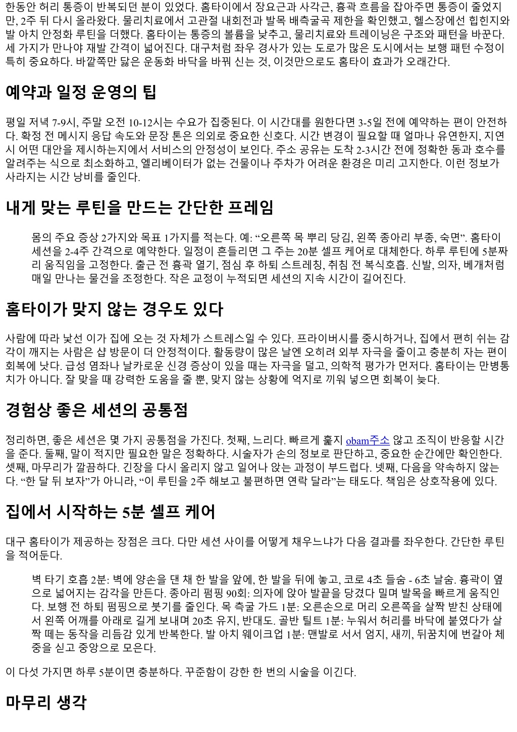 한동안허리통증이반복되던분이있었다. 홈타이에서장요근과사각근, 흉곽흐름을잡아주면통증이줄었지 만, 2주뒤다시올라왔다. 물리치료에서고관절내회전과발목배측굴곡제한을확인했고, 헬스장에선힙힌지와 발아치안정화루틴을더했다. 홈타이는통증의볼륨을낮추고, 물리치료와트레이닝은구조와패턴을바꾼다. 세가지가만나야재발간격이넓어진다. 대구처럼좌우경사가있는도로가많은도시에서는보행패턴수정이 특히중요하다. 바깥쪽만닳은운동화바닥을바꿔신는것, 이것만으로도홈타이효과가오래간다. 예약과일정운영의팁 평일저녁 7-9시, 주말오전 10-12시는수요가집중된다. 이시간대를원한다면 3-5일전에예약하는편이안전하 다. 확정전메시지응답속도와문장톤은의외로중요한신호다. 시간변경이필요할때얼마나유연한지, 지연 시어떤대안을제시하는지에서서비스의안정성이보인다. 주소공유는도착 2-3시간전에정확한동과호수를 알려주는식으로최소화하고, 엘리베이터가없는건물이나주차가어려운환경은미리고지한다. 이런정보가 사라지는시간낭비를줄인다. 내게맞는루틴을만드는간단한프레임 몸의주요증상 2가지와목표 1가지를적는다. 예: “오른쪽목뿌리당김, 왼쪽종아리부종, 숙면”. 홈타이 세션을 2-4주간격으로예약한다. 일정이흔들리면그주는 20분셀프케어로대체한다. 하루루틴에 5분짜 리움직임을고정한다. 출근전흉곽열기, 점심후하퇴스트레칭, 취침전복식호흡. 신발, 의자, 베개처럼 매일만나는물건을조정한다. 작은교정이누적되면세션의지속시간이길어진다. 홈타이가맞지않는경우도있다 사람에따라낯선이가집에오는것자체가스트레스일수있다. 프라이버시를중시하거나, 집에서편히쉬는감 각이깨지는사람은샵방문이더안정적이다. 활동량이많은날엔오히려외부자극을줄이고충분히자는편이 회복에낫다. 급성염좌나날카로운신경증상이있을때는자극을덜고, 의학적평가가먼저다. 홈타이는만병통 치가아니다. 잘맞을때강력한도움을줄뿐, 맞지않는상황에억지로끼워넣으면회복이늦다. 경험상좋은세션의공통점 정리하면, 좋은세션은몇가지공통점을가진다. 첫째, 느리다. 빠르게훑지obam주소않고조직이반응할시간 을준다. 둘째, 말이적지만필요한말은정확하다. 시술자가손의정보로판단하고, 중요한순간에만확인한다. 셋째, 마무리가깔끔하다. 긴장을다시올리지않고일어나앉는과정이부드럽다. 넷째, 다음을약속하지않는 다. “한달뒤보자”가아니라, “이루틴을 2주해보고불편하면연락달라”는태도다. 책임은상호작용에있다. 집에서시작하는 5분셀프케어 대구홈타이가제공하는장점은크다. 다만세션사이를어떻게채우느냐가다음결과를좌우한다. 간단한루틴 을적어둔다. 벽타기호흡 2분: 벽에양손을댄채한발을앞에, 한발을뒤에놓고, 코로 4초들숨 - 6초날숨. 흉곽이옆 으로넓어지는감각을만든다. 종아리펌핑 90회: 의자에앉아발끝을당겼다밀며발목을빠르게움직인 다. 보행전하퇴펌핑으로붓기를줄인다. 목측굴가드 1분: 오른손으로머리오른쪽을살짝받친상태에 서왼쪽어깨를아래로길게보내며 20초유지, 반대도. 골반틸트 1분: 누워서허리를바닥에붙였다가살 짝떼는동작을리듬감있게반복한다. 발아치웨이크업 1분: 맨발로서서엄지, 새끼, 뒤꿈치에번갈아체 중을싣고중앙으로모은다. 이다섯가지면하루 5분이면충분하다. 꾸준함이강한한번의시술을이긴다. 마무리생각