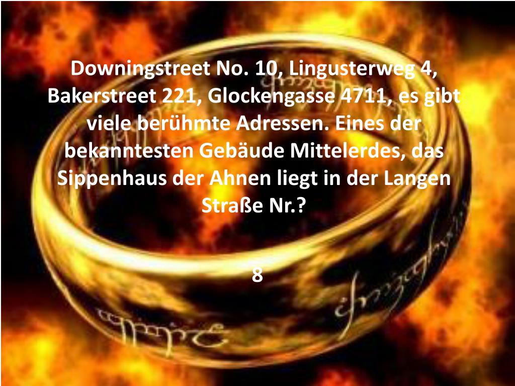 DowningstreetNo. 10, Lingusterweg 4, Bakerstreet 221, Glockengasse 4711, es gibt viele berühmte Adressen. Eines der bekanntesten Gebäude Mittelerdes, das Sippenhaus der Ahnen liegt in der Langen Straße Nr.? 8