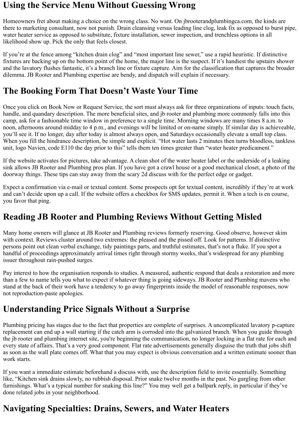 When to Call Instead of Clicking Most jobs is additionally booked on line. A few events factor you to the smartphone. If you odor gasoline close a water heater or furnace, name the gasoline service provider first, then name JB Rooter and Plumbing after the software checks. If you will have a sewer backup that has already reached living parts, call. If your water fundamental broke and you can not come across the shutoff, name. For every thing else, the booking type on www.jbrooterandplumbingca.com will do the process, and also you’ll have a clearer listing of the request. A Simple Two-Step Flow for Speed Demons If you’re in a rush and assured approximately the problem, right here’s a tight means that works smartly on the jb rooter and plumbing site: Pick the nearest provider classification and go with the earliest life like window. In the description, encompass handle landmarks, hindrance specifics, urgency stage, and entry notes. That’s regularly enough to get you at the time table devoid of a single follow-up in the past dispatch. A Homeowner’s Realistic Expectations A authentic plumbing visitors balances urgent calls with scheduled work. If you e book at three p.m. on a wet Thursday, you could get a next day morning slot. That’s no longer a loss of urgency, it’s route math. If which you could close off a