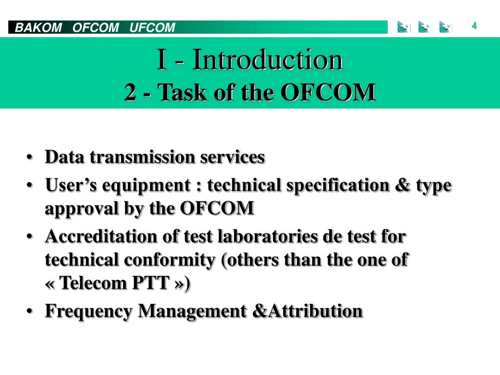 I - Introduction2 - Task of the OFCOM • Data transmission services • User’s equipment : technical specification & type approval by the OFCOM • Accreditation of test laboratories de test for technical conformity (others than the one of « Telecom PTT ») • Frequency Management &Attribution