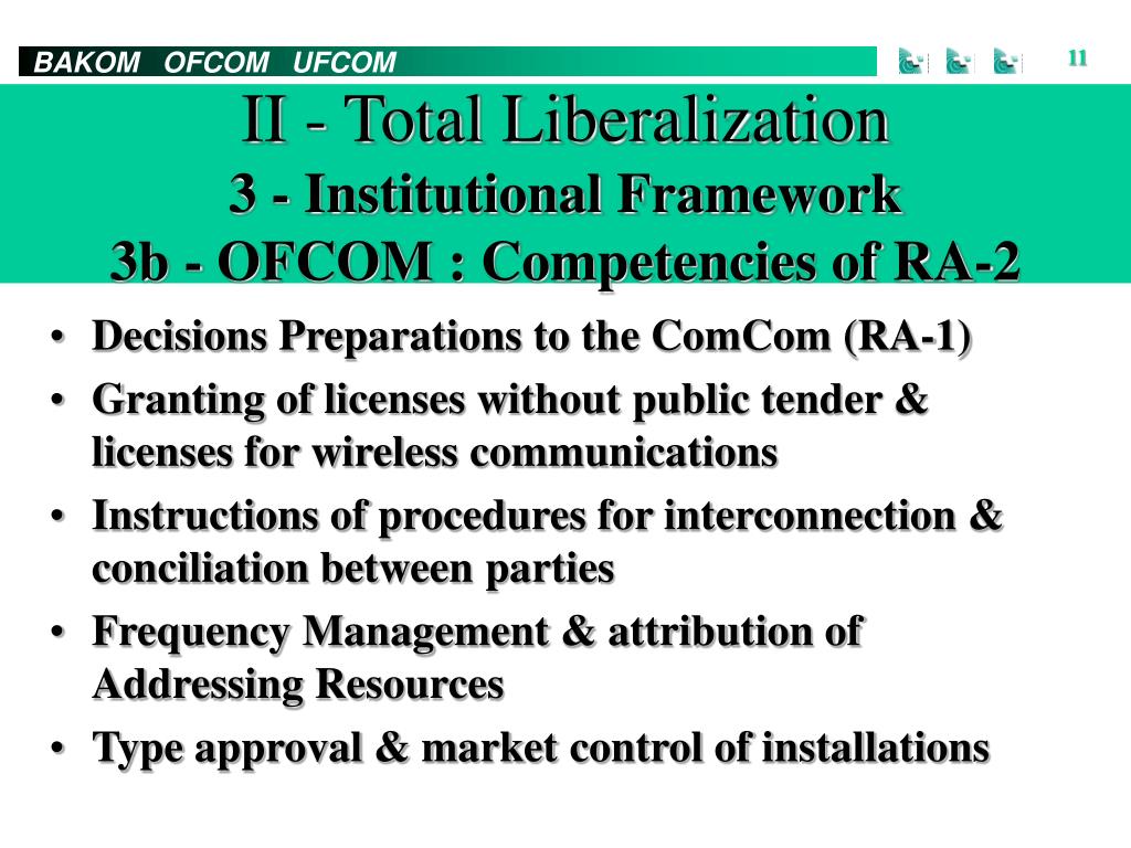 I - Total Liberalization3 - Institutional Framework3a - ComCom : Competencies of RA-1 • Granting of licenses : Public tender, Universal Service, GSM .. • Decisions related to interconnection • Approval of national plan frequency attribution and the numbering plans • Supervisory Measurements • Ordinance : CSC, NP & delegation of some competencies to the OFCOM (RA-2)