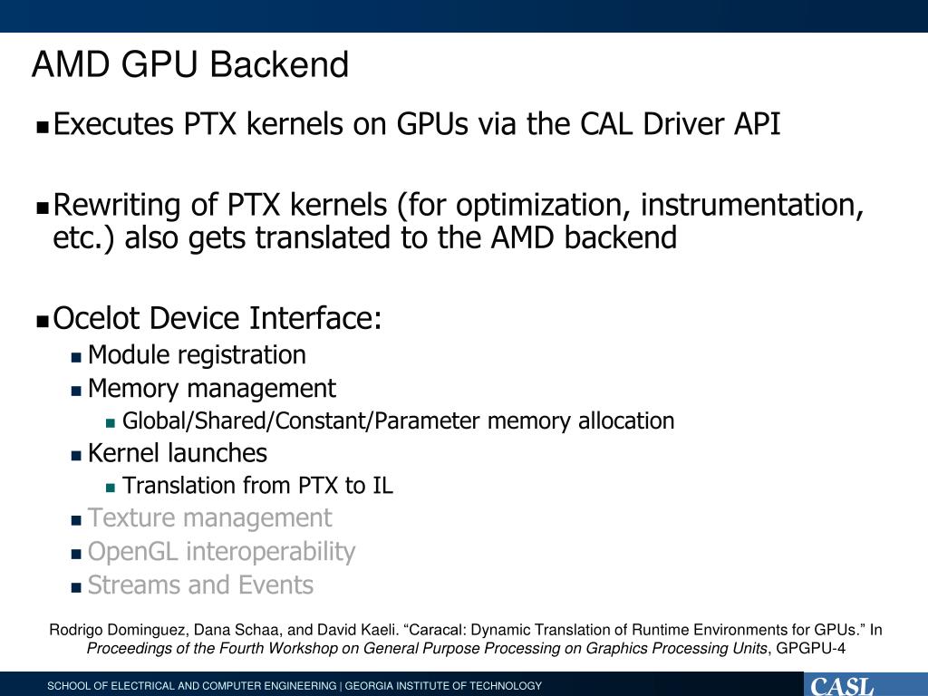 AMD GPU Backend • Executes PTX kernels on GPUs via the CAL Driver API • Rewriting of PTX kernels (for optimization, instrumentation, etc.) also gets translated to the AMD backend • Ocelot Device Interface: • Module registration • Memory management • Global/Shared/Constant/Parameter memory allocation • Kernel launches • Translation from PTX to IL • Texture management • OpenGL interoperability • Streams and Events Rodrigo Dominguez, Dana Schaa, and David Kaeli. “Caracal: Dynamic Translation of Runtime Environments for GPUs.” In Proceedings of the Fourth Workshop on General Purpose Processing on Graphics Processing Units, GPGPU-4