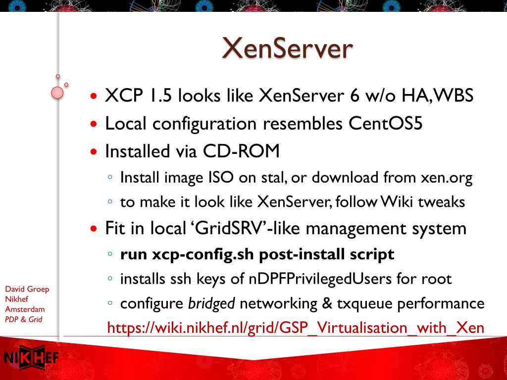 XenServer • XCP 1.5 looks like XenServer 6 w/o HA,WBS • Local configuration resembles CentOS5 • Installed via CD-ROM • Install image ISO on stal, or download from xen.org • to make it look like XenServer, follow Wiki tweaks • Fit in local ‘GridSRV’-like management system • run xcp-config.sh post-install script • installs ssh keys of nDPFPrivilegedUsers for root • configure bridged networking & txqueue performance https://wiki.nikhef.nl/grid/GSP_Virtualisation_with_Xen