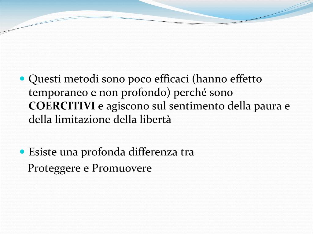 Questi metodi sono poco efficaci (hanno effetto temporaneo e non profondo) perché sono COERCITIVI e agiscono sul sentimento della paura e della limitazione della libertà • Esiste una profonda differenza tra Proteggere e Promuovere