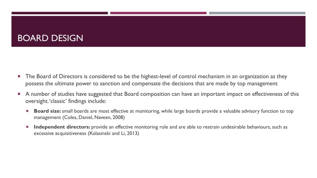 Board design • The Board of Directors is considered to be the highest-level of control mechanism in an organization as they possess the ultimate power to sanction and compensate the decisions that are made by top management • A number of studies have suggested that Board composition can have an important impact on effectiveness of this oversight. ‘classic’ findings include: • Board size: small boards are most effective at monitoring, while large boards provide a valuable advisory function to top management (Coles, Daniel, Naveen, 2008) • Independent directors: provide an effective monitoring role and are able to restrain undesirable behaviours, such as excessive acquisitiveness (Kolasinskiand Li, 2013)