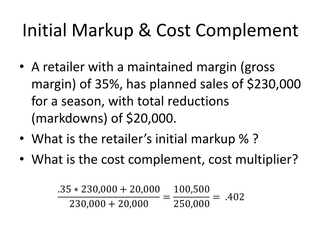 Initial Markup & Cost Complement • A retailer with a maintained margin (gross margin) of 35%, has planned sales of $230,000 for a season, with total reductions (markdowns) of $20,000. • What is the retailer’s initial markup % ? • What is the cost complement, cost multiplier?