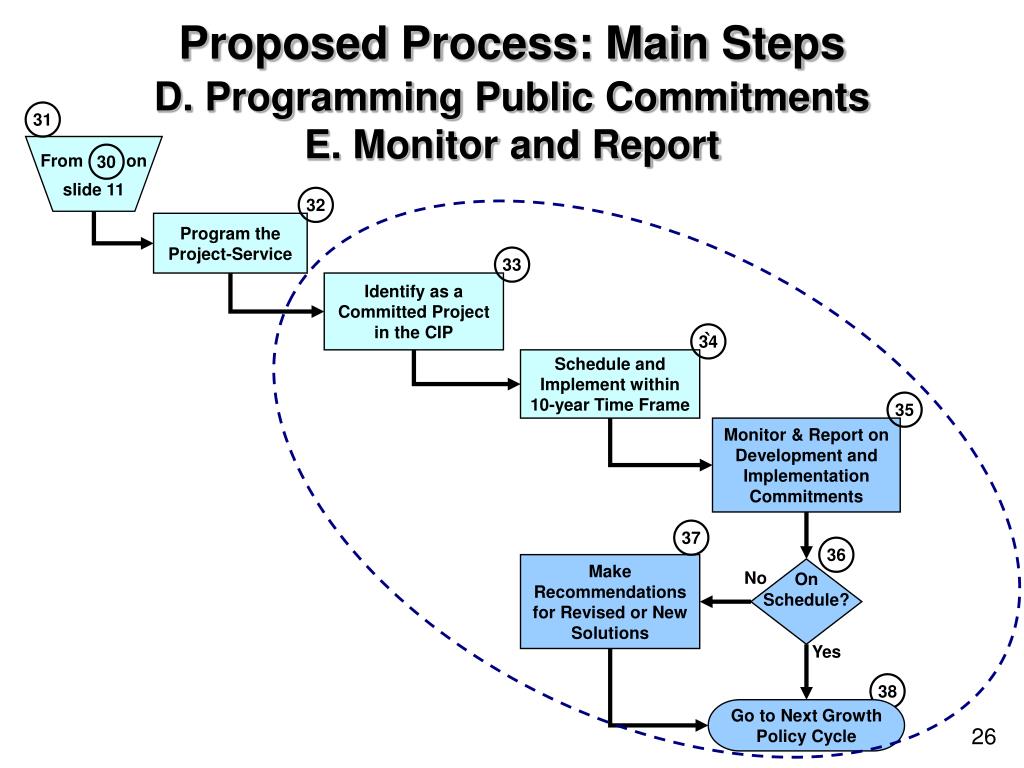 Program the Project-Service Identify as a Committed Project in the CIP Schedule and Implement within 10-year Time Frame ` Monitor & Report on Development and Implementation Commitments 30 33 34 37 32 35 38 31 36 Make Recommendations for Revised or New Solutions No On Schedule? From on slide 11 Yes Go to Next Growth Policy Cycle Proposed Process: Main StepsD. Programming Public Commitments E. Monitor and Report