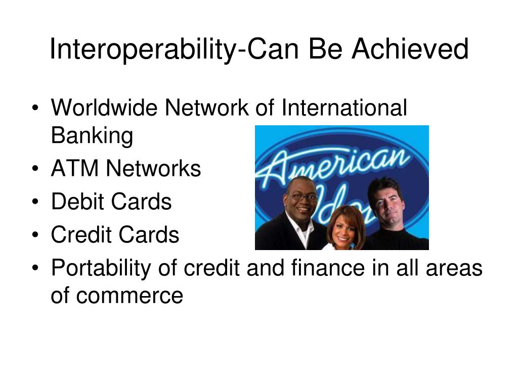 Interoperability-Can Be Achieved • Worldwide Network of International Banking • ATM Networks • Debit Cards • Credit Cards • Portability of credit and finance in all areas of commerce