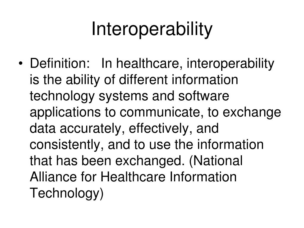 Interoperability • Definition: In healthcare, interoperability is the ability of different information technology systems and software applications to communicate, to exchange data accurately, effectively, and consistently, and to use the information that has been exchanged. (National Alliance for Healthcare Information Technology)