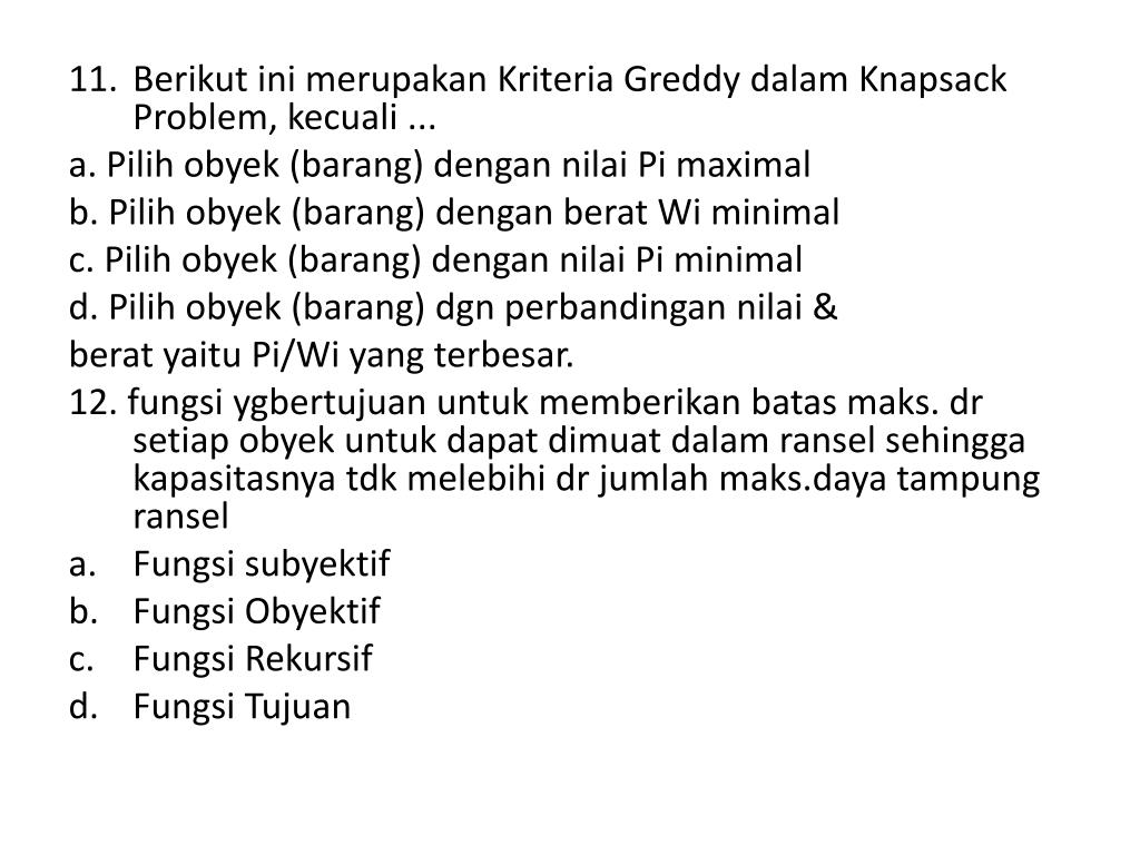 Berikut ini merupakan Kriteria Greddy dalam Knapsack Problem, kecuali ... a. Pilih obyek (barang) dengan nilai Pi maximal b. Pilih obyek (barang) dengan berat Wi minimal c. Pilih obyek (barang) dengan nilai Pi minimal d. Pilih obyek (barang) dgn perbandingan nilai & berat yaitu Pi/Wi yang terbesar. 12. fungsi ygbertujuan untuk memberikan batas maks. dr setiap obyek untuk dapat dimuat dalam ransel sehingga kapasitasnya tdk melebihi dr jumlah maks.daya tampung ransel • Fungsi subyektif • Fungsi Obyektif • Fungsi Rekursif • Fungsi Tujuan
