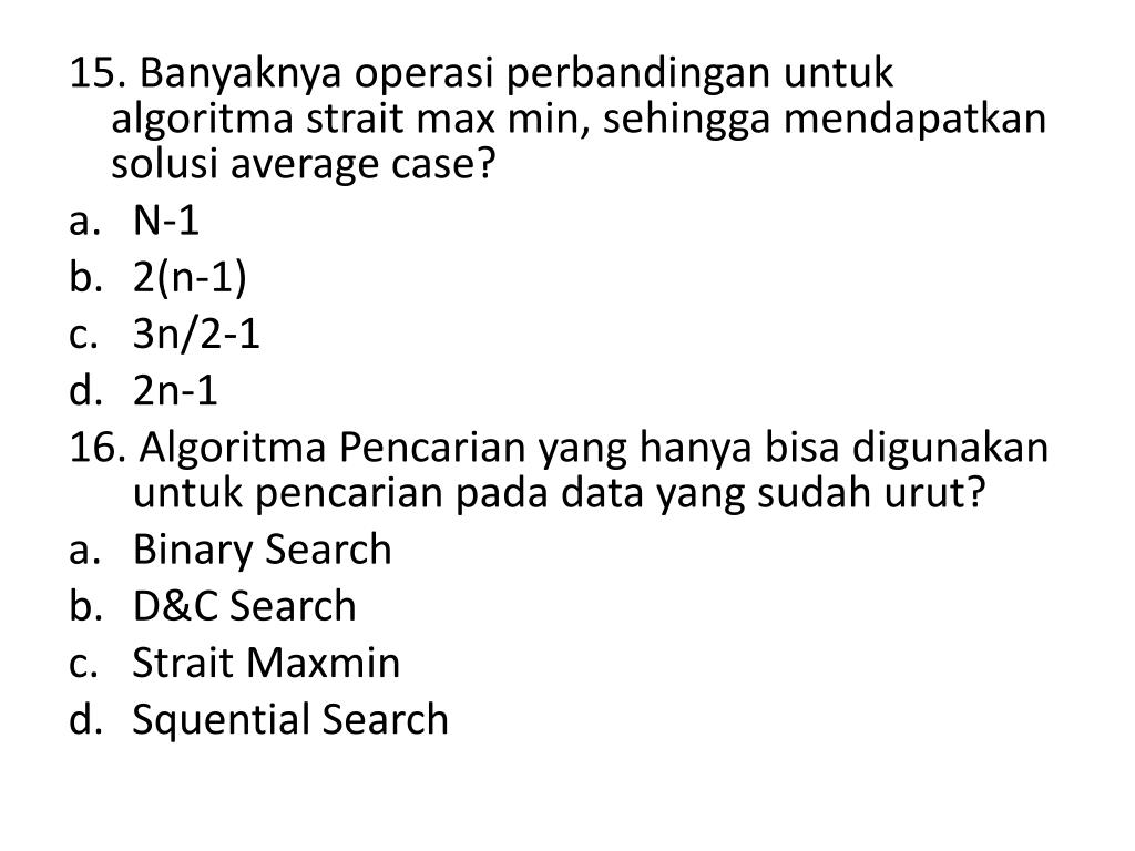 15. Banyaknya operasi perbandingan untuk algoritma strait max min, sehingga mendapatkan solusi average case? • N-1 • 2(n-1) • 3n/2-1 • 2n-1 16. Algoritma Pencarian yang hanya bisa digunakan untuk pencarian pada data yang sudah urut? • Binary Search • D&C Search • Strait Maxmin • Squential Search