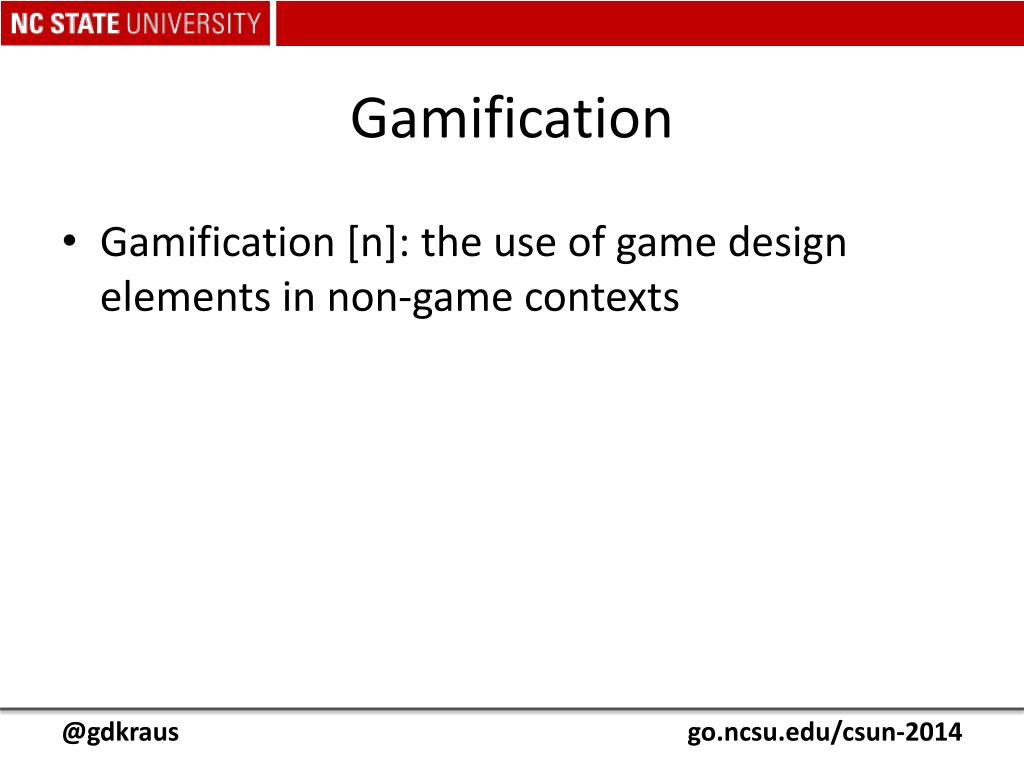 The Gamification of Accessibility. Greg Kraus University IT Accessibility Coordinator NC State University http:// go.ncsu.edu /csun2014. Gamification. Gamification [n]: the use of game design elements in non-game contexts. Accessibility is Not a Game. It’s a human right