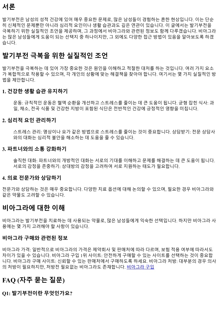 A1: 발기부전은성행위를위해충분한발기를유지하지못하는상태를의미하며, 여러가지원인으로발생할수 있습니다. Q2: 얼마나많은남성이발기부전을경험하나요? A2: 연구에따르면성인남성중약 30%가일생동안어느시점에서발기부전을경험하는것으로나타났습니다. Q3: 비아그라는어떻게작용하나요? A3: 비아그라는혈관을확장시켜혈류량을증가시키며, 이로인해발기가더쉽게이루어질수있도록도와줍니 다. Q4: 모든남성이비아그라를사용할수있나요? A4: 아닙니다. 일부남성은특정질병이나약물을복용중일경우사용이금지될수있으므로전문가와상담해야 합니다. Q5: 자연요법으로발기부전을개선할수있나요? A5: 예, 운동과건강한식습관등자연적인방법으로증상을완화시킬수있지만, 효과는개인마다다릅니다. Q6: 비아그라구매시주의해야할점은무엇인가요? A6: 신뢰할수있는판매처에서구매하며, 가짜약물에대한주의를기울여야합니다. 결론 발기부전은많은남성이직면하는일반적인문제이며, 이를극복하기위해서는다양한접근방식이필요합니다. 건강한생활습관부터심리적안정까지여러요소가복합적으로작용하므로자신에게맞는방법을찾아가는것 이중요합니다. 또한필요하다면비아그라와같은약물을고려해볼수도있지만반드시전문가의조언을받는 것이바람직합니다. 마지막으로, 이주제에대한논의를통해더많은사람들이자신의문제를이해하고해결해나갈수있기를바랍 니다. 여러분모두가보다건강하고행복한삶을누리기를기원합니다!