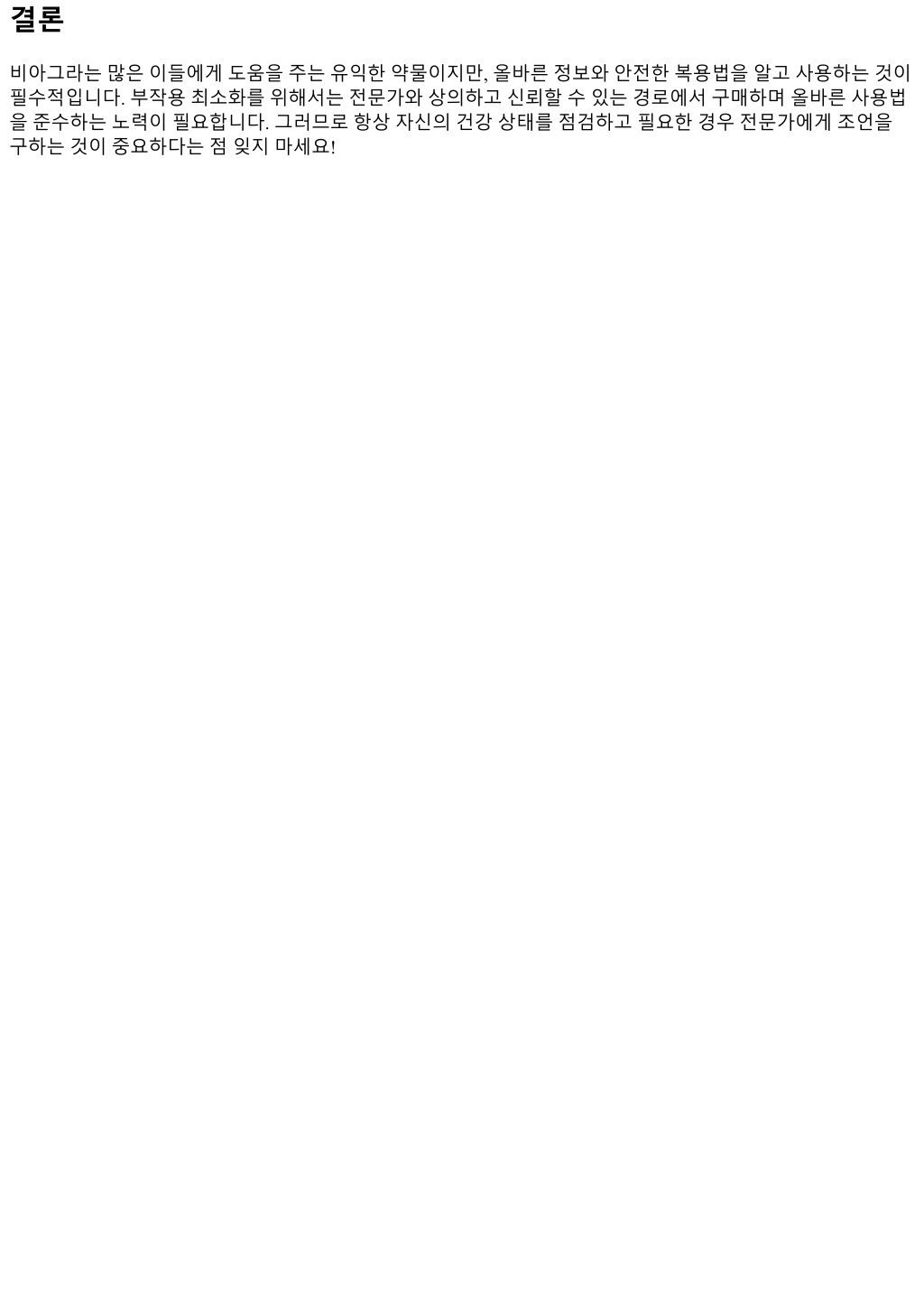 결론 비아그라는많은이들에게도움을주는유익한약물이지만, 올바른정보와안전한복용법을알고사용하는것이 필수적입니다. 부작용최소화를위해서는전문가와상의하고신뢰할수있는경로에서구매하며올바른사용법 을준수하는노력이필요합니다. 그러므로항상자신의건강상태를점검하고필요한경우전문가에게조언을 구하는것이중요하다는점잊지마세요!