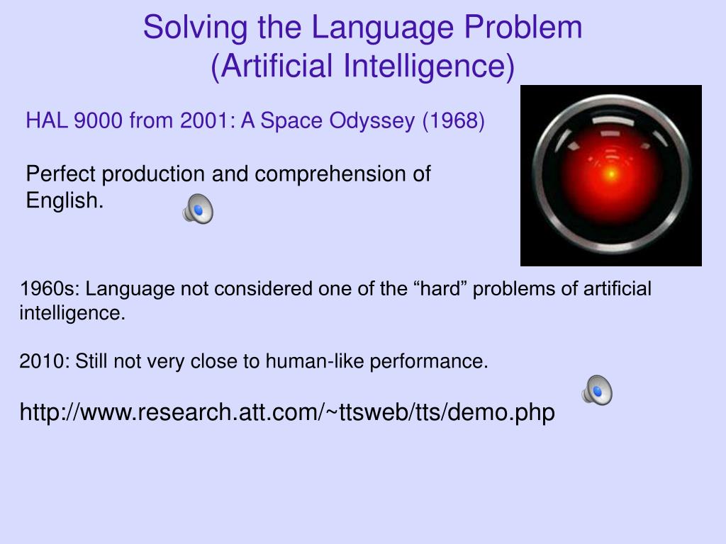 Solving the Language Problem (Artificial Intelligence) HAL 9000 from 2001: A Space Odyssey (1968) Perfect production and comprehension of English. 1960s: Language not considered one of the “hard” problems of artificial intelligence. 2010: Still not very close to human-like performance. http://www.research.att.com/~ttsweb/tts/demo.php