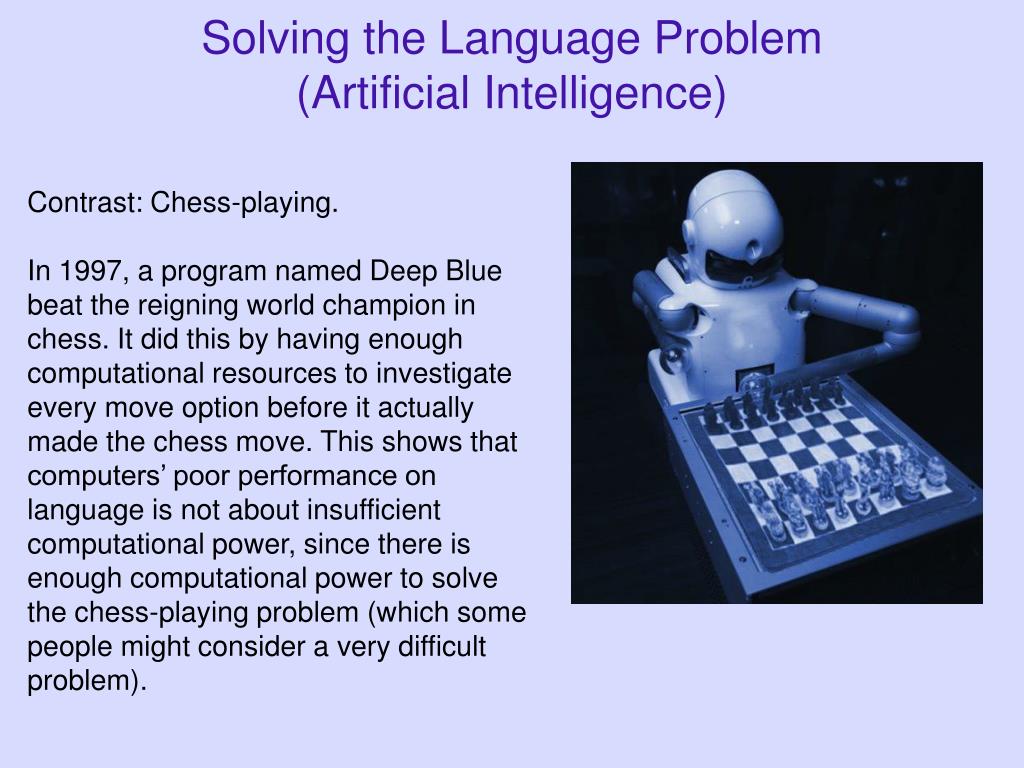 Solving the Language Problem (Artificial Intelligence) Contrast: Chess-playing. In 1997, a program named Deep Blue beat the reigning world champion in chess. It did this by having enough computational resources to investigate every move option before it actually made the chess move. This shows that computers’ poor performance on language is not about insufficient computational power, since there is enough computational power to solve the chess-playing problem (which some people might consider a very difficult problem).