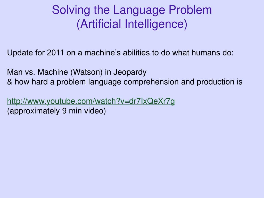 Solving the Language Problem (Artificial Intelligence) Update for 2011 on a machine’s abilities to do what humans do: Man vs. Machine (Watson) in Jeopardy & how hard a problem language comprehension and production is http://www.youtube.com/watch?v=dr7IxQeXr7g (approximately 9 min video)