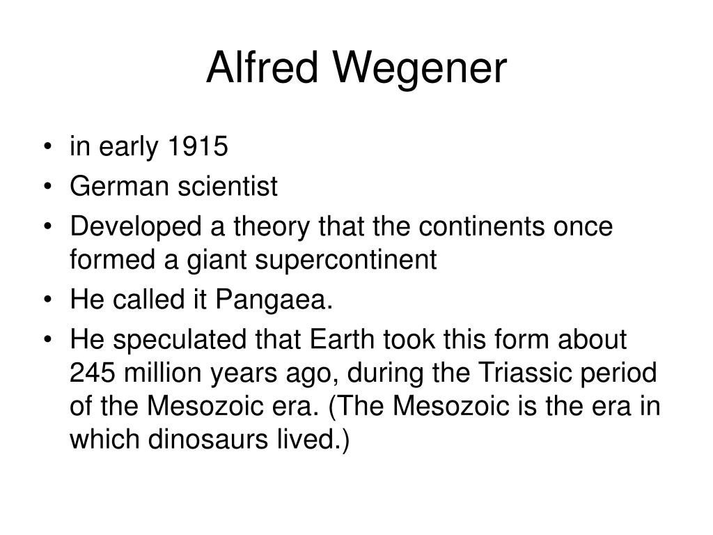 Alfred Wegener • in early 1915 • German scientist • Developed a theory that the continents once formed a giant supercontinent • He called it Pangaea. • He speculated that Earth took this form about 245 million years ago, during the Triassic period of the Mesozoic era. (The Mesozoic is the era in which dinosaurs lived.)