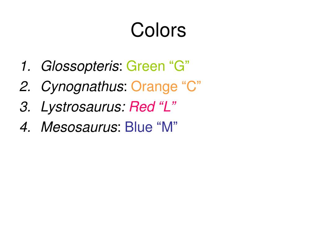 Colors • Glossopteris: Green “G” • Cynognathus: Orange “C” • Lystrosaurus: Red “L” • Mesosaurus: Blue “M”