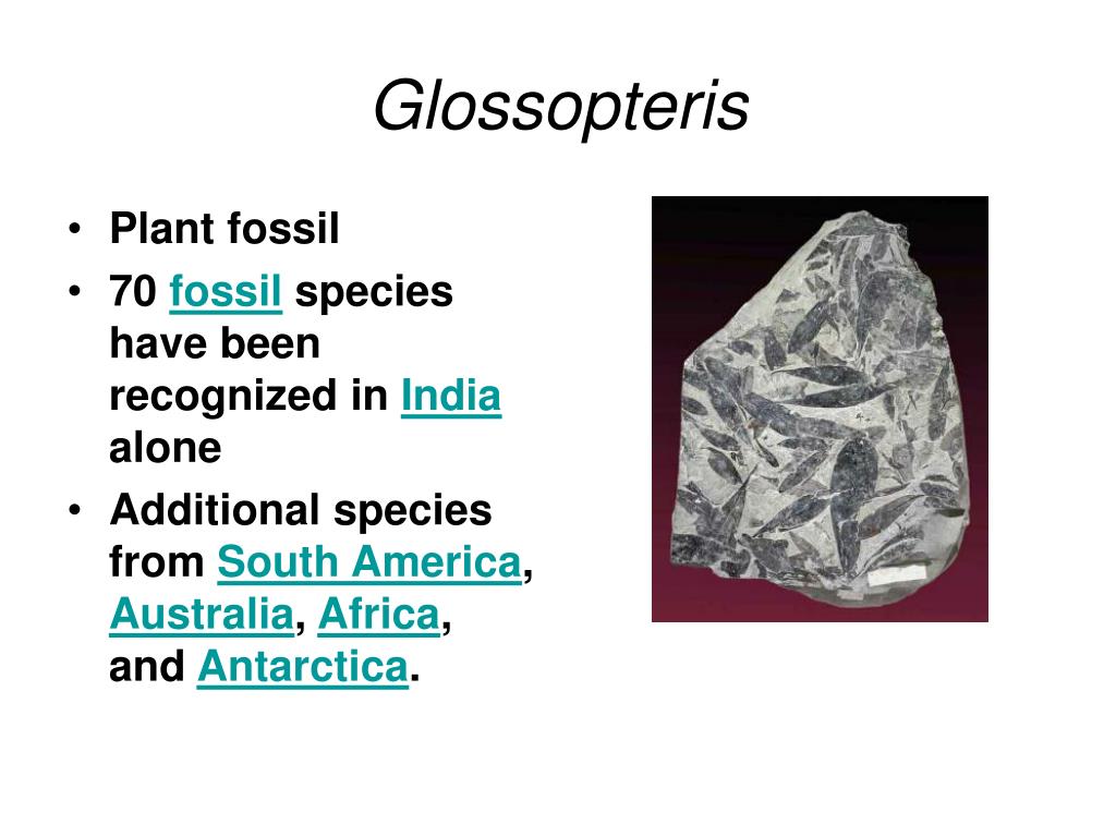 Glossopteris • Plant fossil • 70 fossil species have been recognized in India alone • Additional species from South America, Australia, Africa, and Antarctica.