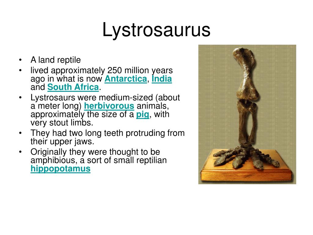 Lystrosaurus • A land reptile • lived approximately 250 million years ago in what is now Antarctica, India and South Africa. • Lystrosaurs were medium-sized (about a meter long) herbivorous animals, approximately the size of a pig, with very stout limbs. • They had two long teeth protruding from their upper jaws. • Originally they were thought to be amphibious, a sort of small reptilian hippopotamus