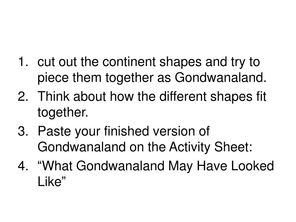 cut out the continent shapes and try to piece them together as Gondwanaland. • Think about how the different shapes fit together. • Paste your finished version of Gondwanaland on the Activity Sheet: • “What Gondwanaland May Have Looked Like”