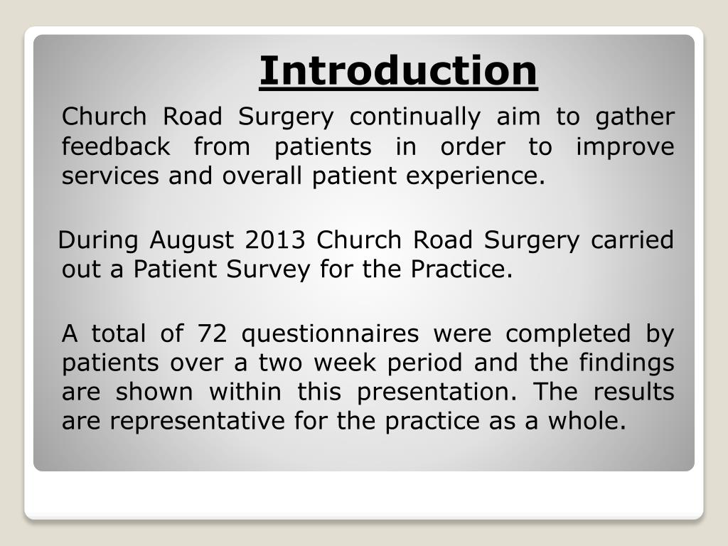 Introduction Church Road Surgery continually aim to gather feedback from patients in order to improve services and overall patient experience. During August 2013 Church Road Surgery carried out a Patient Survey for the Practice. A total of 72 questionnaires were completed by patients over a two week period and the findings are shown within this presentation. The results are representative for the practice as a whole.