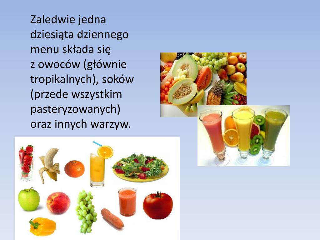 Zaledwie jedna dziesiąta dziennego menu składa się z owoców (głównie tropikalnych), soków (przede wszystkim pasteryzowanych) oraz innych warzyw.